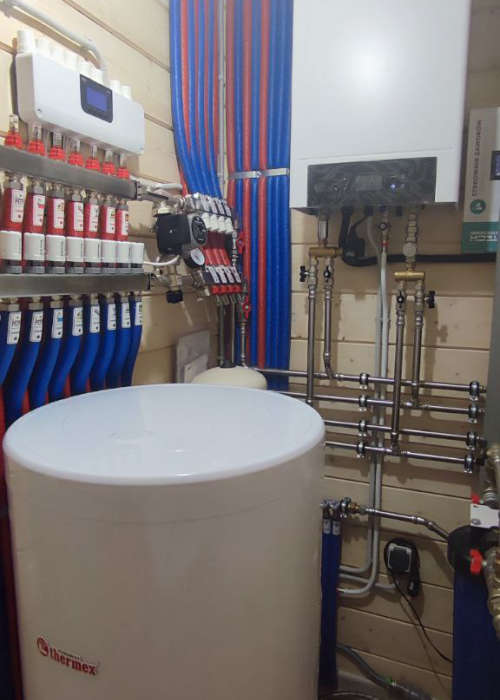 Для реализации проекта было выбрано оборудование Thermex: котёл QUANTUM E908 OTWF и бойлер INOX на 150 литров. Электрический котёл — это современное решение, которое не требует сложного согласования, отличается бесшумной работой и высоким КПД. А бойлер косвенного нагрева позволяет экономично обеспечивать дом горячей водой для бытовых нужд, используя тепло от основного контура отопления.